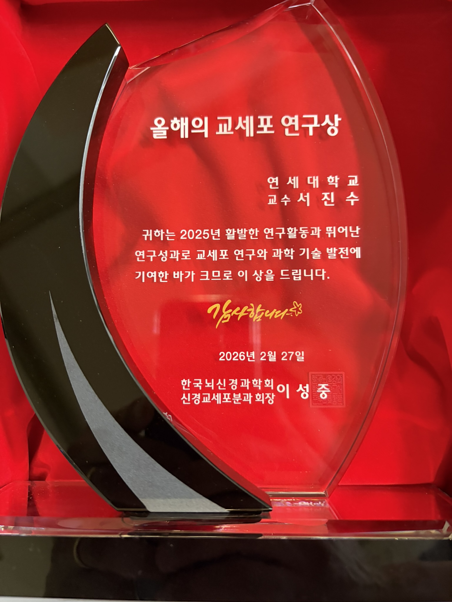 TitleJinsoo received the 'Glia Researcher Award of the Year'2026-02-27 13:37Nameadmin ListReplyWrite Comment [0] CommentName(*)Password(*)Captcha Code(Enter the auto register prevention code)Content(*) Comment Write MorePrevJinsoo received the 2025 Yonsei University Outstanding Teaching Awardadmin 2026-03-26NextJuran's paper was published in Alzheimer's & Dementia !!admin 2025-09-21 Powered by MangBoard | 망보드 스토어